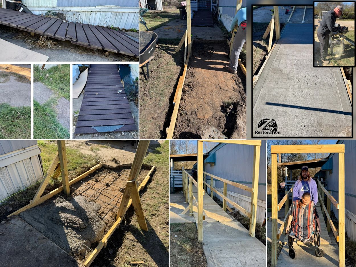We were referred by The Manna House on this project. A couple living on disability due to one being a double amputee and the other injured were in need of a new wheelchair ramp. The one that they had was not sufficient and unsafe. This is the what the original accommodations looked like. We also noticed the concrete sidewalk was not sufficient for wheelchair access. So we determined they qualified for our services and took on the project. With the help of The Manna House in Midlothian by helpi